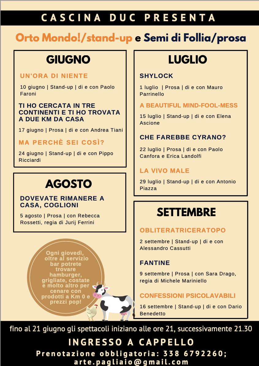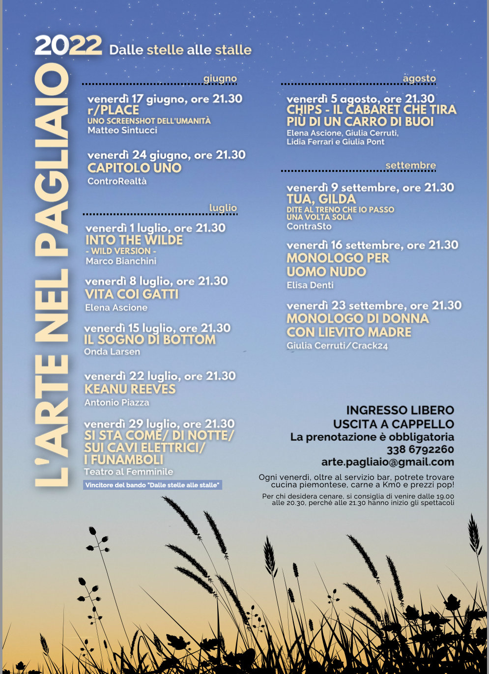 Nato nell’estate del 2017, “L’arte nel pagliaio” è un Festival teatrale realizzato in collaborazione con Crack24 con l’obiettivo di portare il teatro all’interno di un contesto nuovo, non convenzionale, che possa avvicinare il pubblico a un teatro stimolante, divertente e accattivante. Durante ogni data prevista dal festival, la cascina offre un servizio di ristorazione in grado di rispondere a ogni esigenza del pubblico. Un’alternativa più rustica e informale alle poltrone rosse in velluto.